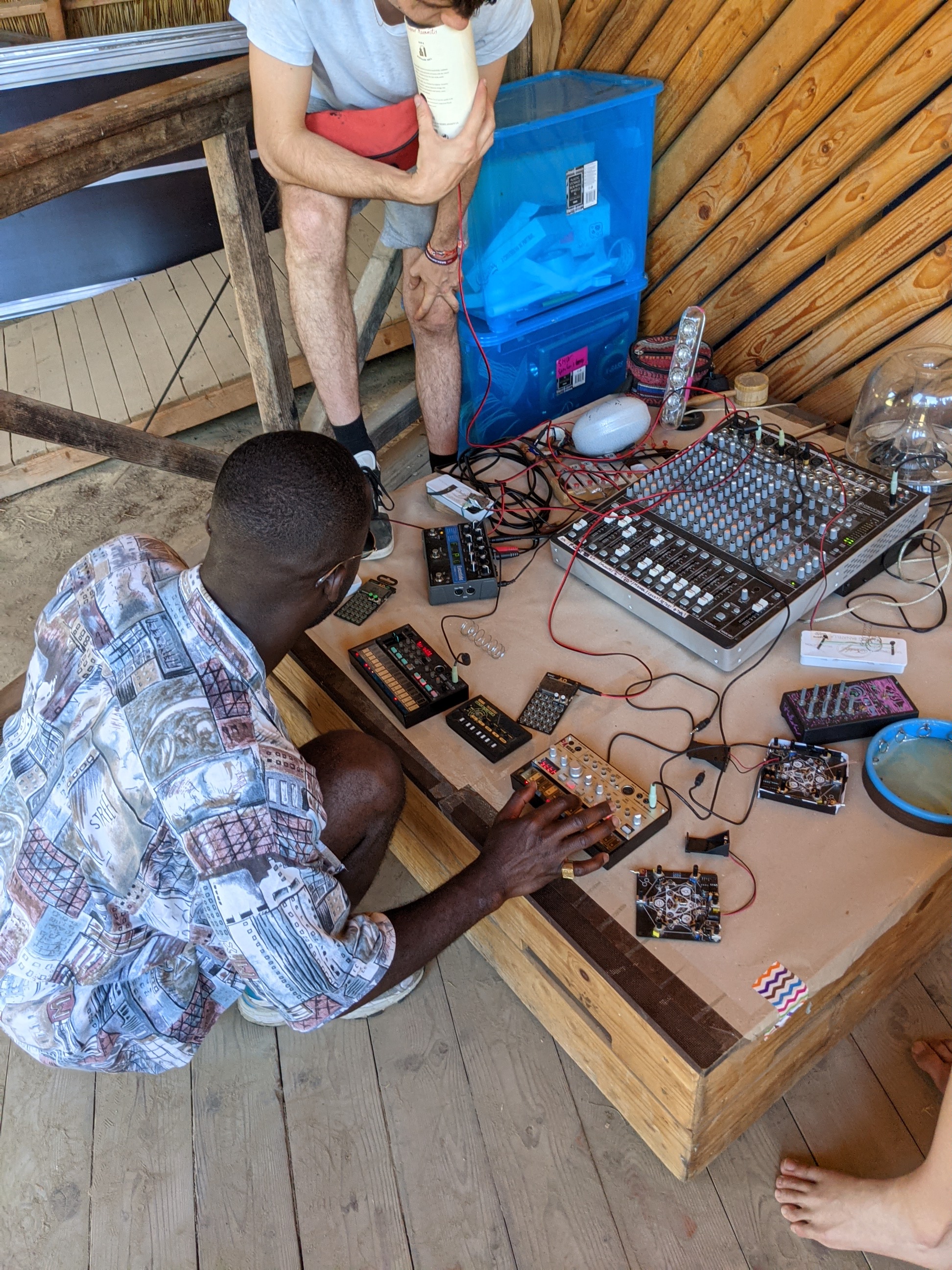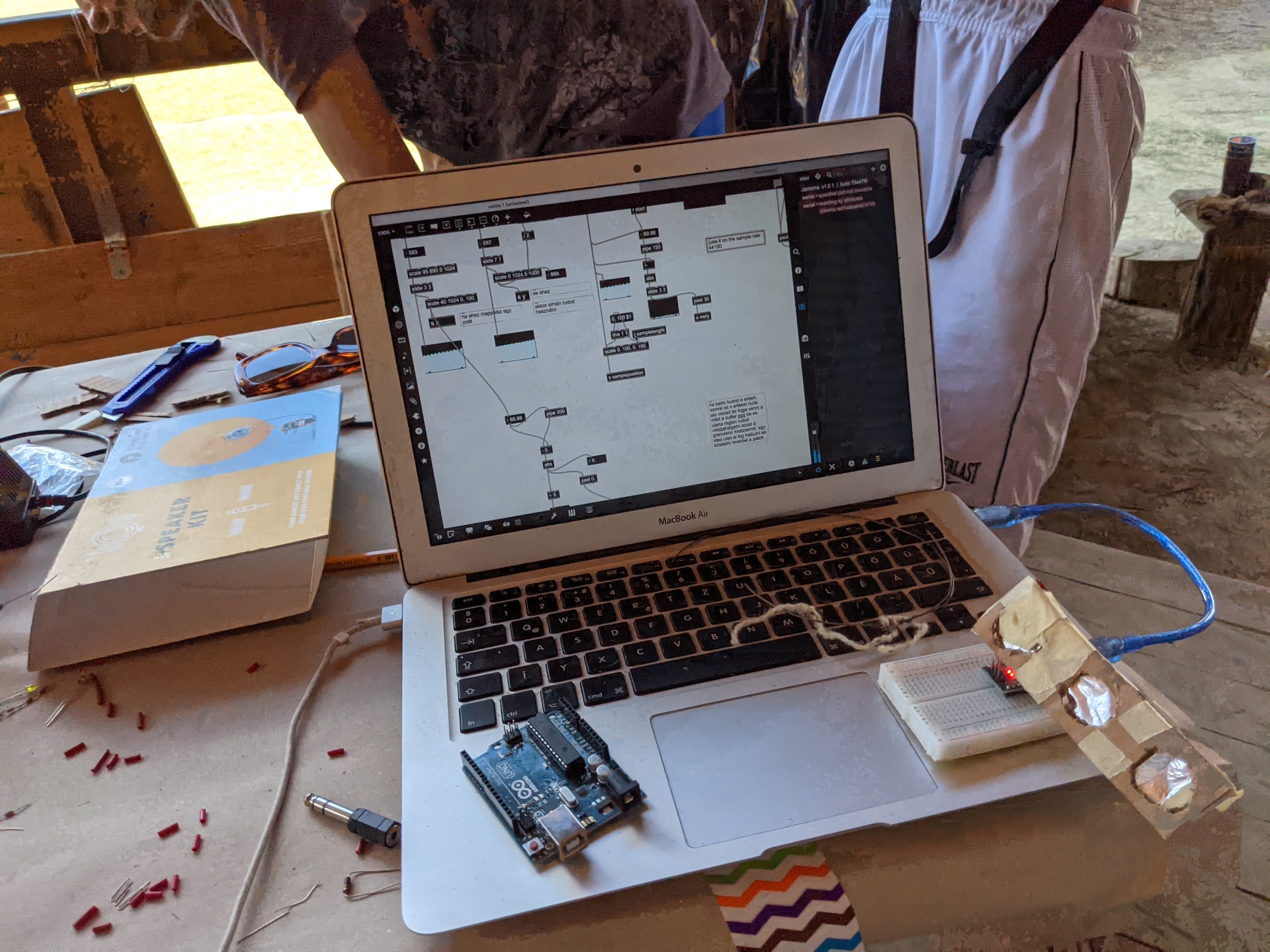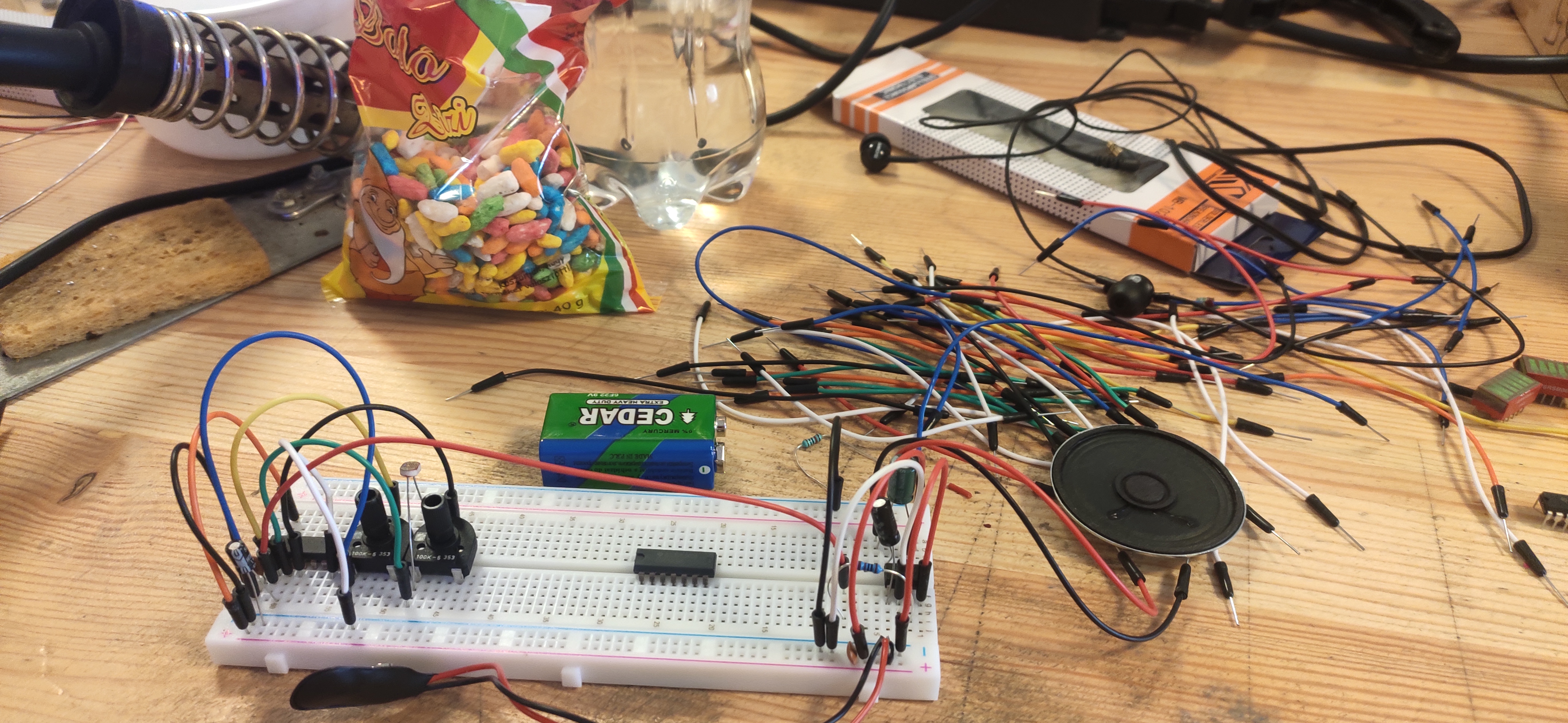 to be part of the crew with whom we have organised the Sound Hacking workshop at daad festival. The 4-day long event consisted of teaching visitors electronics basics and developing different kind of small instruments from scratch. To name a few: we had sunlight powered snythetisers, touch-based keyboards and freakish max patches connected to natural materials found around.